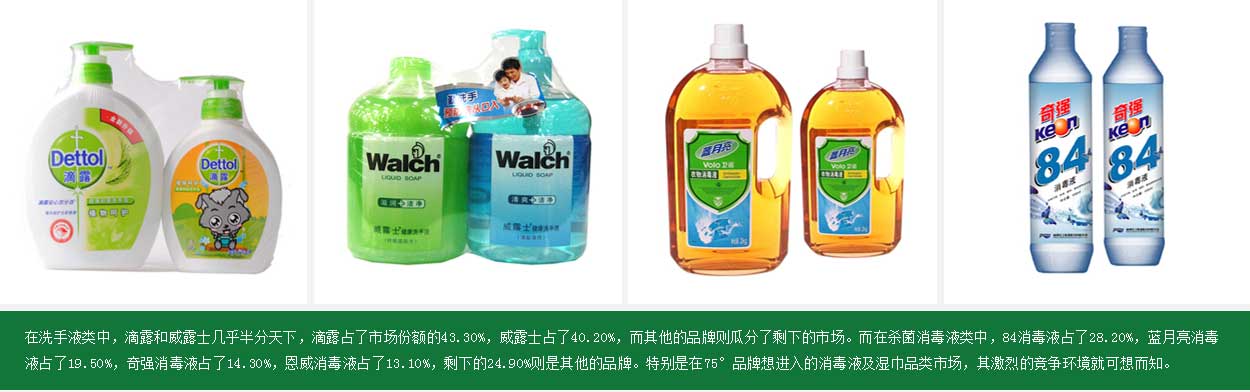在衛(wèi)生消毒產(chǎn)品領(lǐng)域,品牌競爭非常激烈,消毒液以及濕巾兩大品類難以突圍。而75°品牌的競爭對手主要有洗手液類、殺菌消毒液、免水潔手液和護(hù)理濕巾類四大類,目前競爭的四大品類細(xì)分市場中,每一個(gè)領(lǐng)域都有絕對的領(lǐng)導(dǎo)者或強(qiáng)勢品牌。