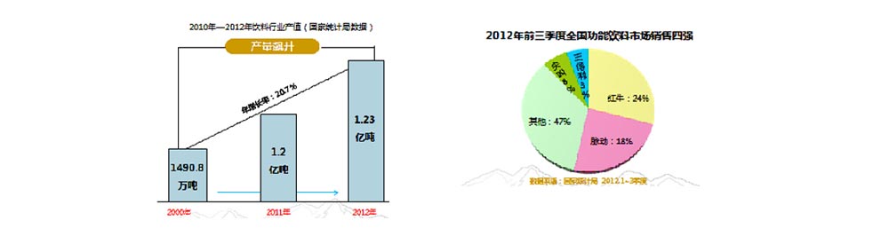 其中,功能飲料呈現(xiàn)出良好的發(fā)展勢(shì)頭。產(chǎn)品種類不斷增加,并且深受消費(fèi)者喜愛, 2008 年功能性飲料整體增速約為29%,2012 年增速達(dá)到34%,功能飲料總?cè)萘?430--500億; 2012 年,我國(guó)已經(jīng)成為世界飲料第一大國(guó),其中功能飲料市場(chǎng)潛力巨大!