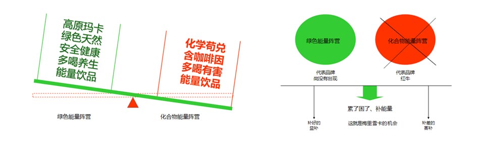 針對(duì)我們的目標(biāo),不做市場(chǎng)的跟隨者,而是作為起義者、挑戰(zhàn)者的姿態(tài)出現(xiàn),切開紅牛、東鵬的市場(chǎng),找到并占領(lǐng)梅里雪卡的市場(chǎng)區(qū)間。