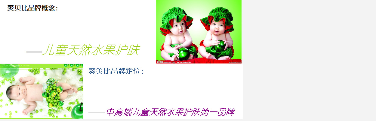 爽貝比以水果為主要原材料,提取水果素,水果精華,水果活性因子,用來(lái)兒童護(hù)膚,天然、健康、環(huán)保、安全,是一個(gè)好產(chǎn)品的重要體現(xiàn)!借水果部落故事片,以角色營(yíng)銷為切入口,樹(shù)立水果護(hù)膚新理念。創(chuàng)造一個(gè)水果護(hù)膚部落,塑造一系列水果寶貝,形成一系列水果護(hù)膚故事。全面貫徹天然水果護(hù)膚理念。
