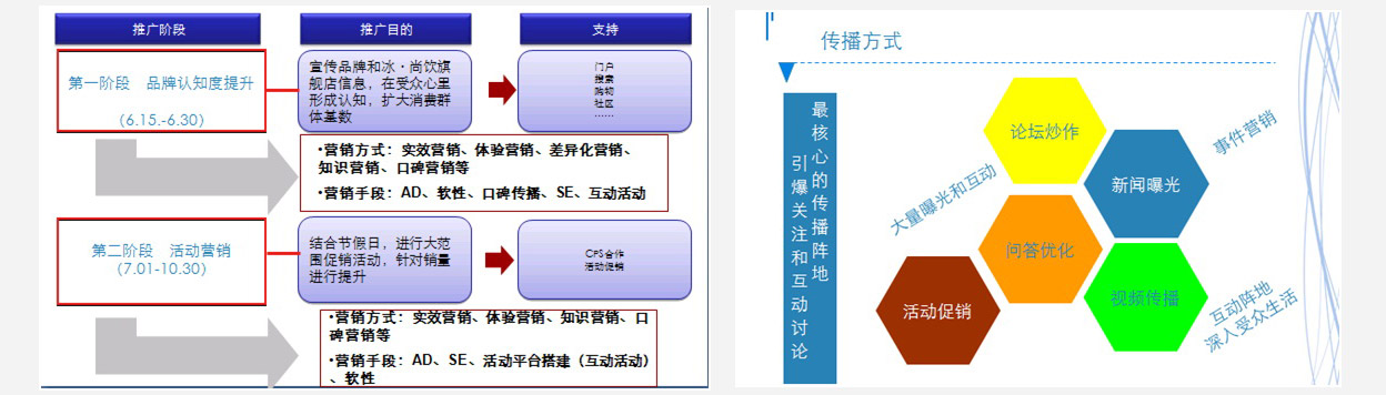 中擂觀點認為冰·尚飲作為一個專注于年輕時尚、兒童的網(wǎng)購品牌,以魔力冰沙杯產(chǎn)品為主打,依靠網(wǎng)購平臺進行銷售。中擂認為在推廣傳播上應以網(wǎng)絡推廣為主,針對全民網(wǎng)友,特別是時尚白領、潮流一族、學生群體宣揚冰尚飲的品牌形象,美加好作為全新的品牌在中國發(fā)展需要提高其知名度和影響力,為此中擂針對冰尚飲的線上線下的渠道規(guī)劃提出了傳播的總體思路規(guī)劃,先是積累人氣,達到一定的轉(zhuǎn)化率從而促進產(chǎn)品的營銷,其次通過良好的服務達到口碑營銷的效果,這樣可以提升顧客的回頭率,2013年對于冰尚飲的品牌建立成長是非常關鍵的一年,需要解決提升知名度、樹立企業(yè)形象、促進銷售的任務。中擂作出了從不同角度達到不同品牌效應的傳播推廣,全方位的網(wǎng)絡營銷可以擴大品牌在消費者中的知曉面,多角度的論壇營銷可以提升品牌在互聯(lián)網(wǎng)上的瀏覽量,意見性的博客營銷可以刺激提升品牌的關注度,助推式口碑營銷可以提高品牌度。