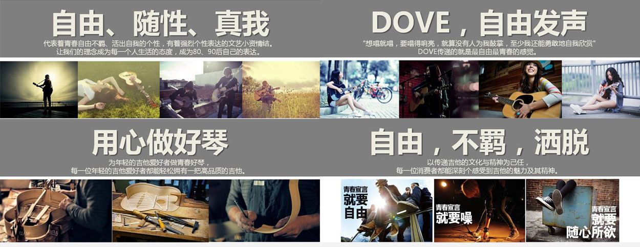 DOVE專心做好心,為有音樂夢(mèng)想的人打造具有高性價(jià)比的高品質(zhì)時(shí)尚吉他產(chǎn)品,讓每一位熱愛吉他的年輕愛好者都能擁有一把好琴,讓品牌成為年輕消費(fèi)者的購琴首選。用5年實(shí)現(xiàn)中國木吉它民族領(lǐng)導(dǎo)品牌,用10年實(shí)現(xiàn)全球木吉它消費(fèi)者首選品牌,用100年實(shí)現(xiàn)傳承中華民族精神的全球老字號(hào)經(jīng)典品牌。