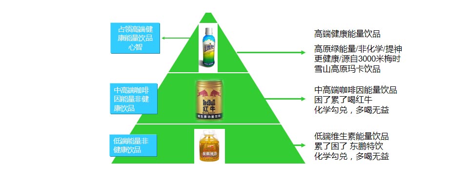 瑪卡,一種生長(zhǎng)在海拔四千米以上高原上的綠色植物,是古印加人用于軍隊(duì)能量補(bǔ)充的,其所能提供的能量是天然的、健康的、高品質(zhì)的,而非人工合成的化學(xué)能量,這些特點(diǎn)支持了它相比紅牛、東鵬能量產(chǎn)品更具競(jìng)爭(zhēng)力、更具溢價(jià)能力,因?yàn)樘烊?、健康、能量更?qiáng)大。因此,能夠占領(lǐng)高端市場(chǎng),塑造更高的產(chǎn)品形象——高端健康能量。