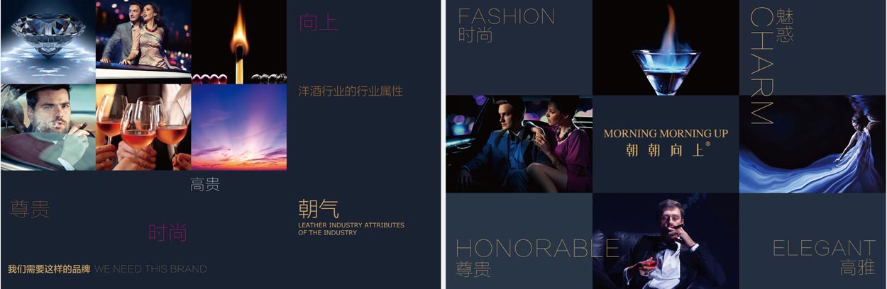 不僅是對(duì)文字的重新設(shè)計(jì),我們還對(duì)品牌的色彩進(jìn)行提升。因?yàn)?ldquo;朝朝向上”是一款面向中高端成功人士的養(yǎng)生酒,擁有洋酒的奢華尊貴的品質(zhì),所以我們選擇尊貴藍(lán)作為主色調(diào),幽暗迷人的尊貴藍(lán)讓人聯(lián)想到優(yōu)雅安靜的酒吧,尊貴的男士正細(xì)細(xì)品味這懂男人的酒——“朝朝向上”,彰顯尊貴、神秘、浪漫、魅惑的格調(diào)。