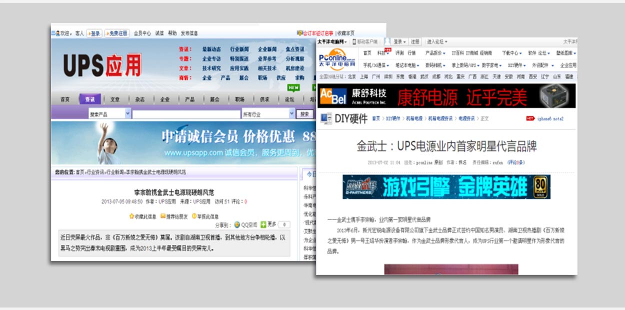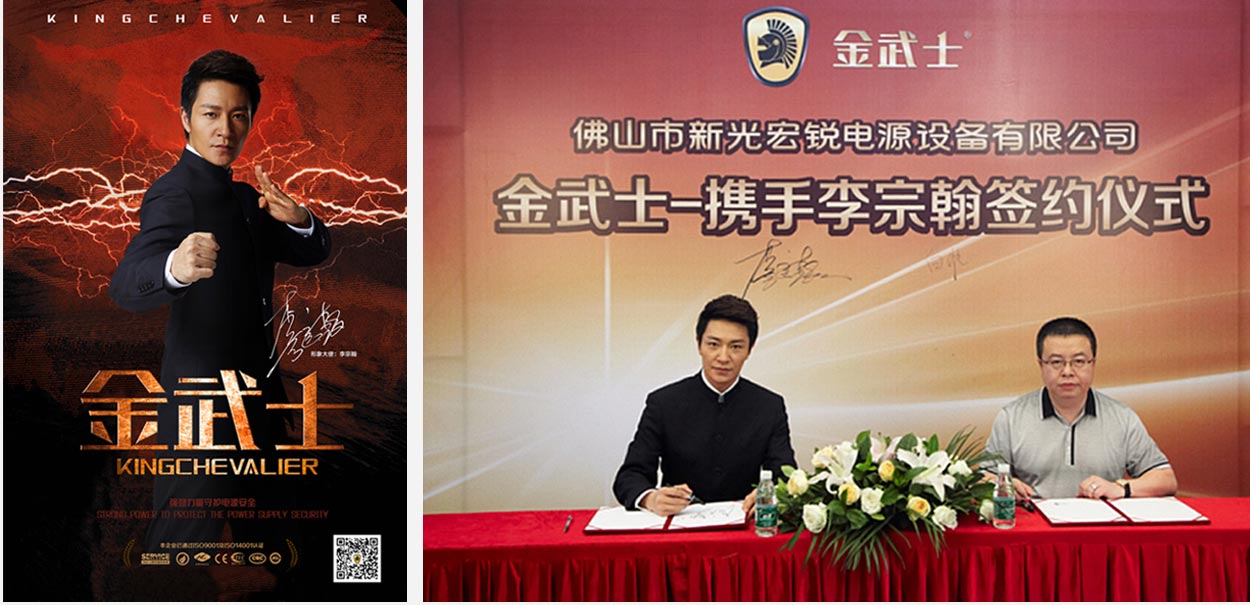 在CCBD中擂的協(xié)助下,2013年6月21日,新光宏銳電源設(shè)備有限公司金武士品牌正式簽約中國知名男演員、湖南衛(wèi)視熱播劇《百萬新娘之愛無悔》男一號王紹華扮演者李宗翰先生作為金武士品牌形象代言人,成為UPS行業(yè)第一個邀請明星作為形象代言的品牌。通過系列的宣傳推廣,極大地提升了金武士品牌的市場知名度與美譽(yù)度。