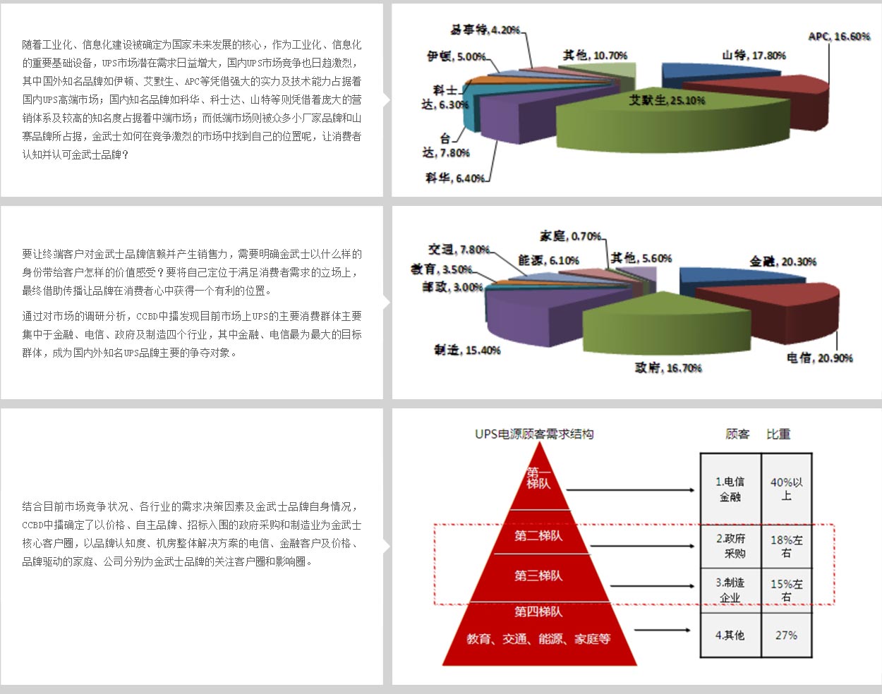 由此CCBD中擂對政府、行業(yè)客戶及普通消費(fèi)者等金武士目標(biāo)及影響消費(fèi)群進(jìn)行深入調(diào)研。通過研究發(fā)現(xiàn)安全、可靠、實(shí)效、解決問題是目標(biāo)消費(fèi)者所最為關(guān)注的需求點(diǎn)。對于客戶來說,他們要的不僅僅UPS產(chǎn)品,而是一個完整的電力保護(hù)解決方案 。