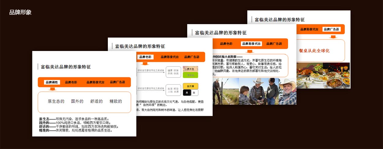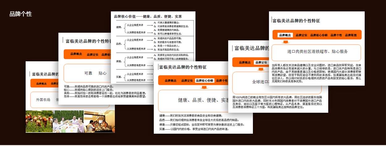 中擂認(rèn)為,富臨美達(dá)用100%純進(jìn)口的概念能有效區(qū)分國(guó)內(nèi)所有的大品牌。通過(guò)走進(jìn)社區(qū),用社區(qū)連鎖的服務(wù)阻隔國(guó)外進(jìn)口肉類(lèi)的大品牌,同時(shí)充分利用國(guó)內(nèi)消費(fèi)者對(duì)于消費(fèi)國(guó)外進(jìn)口產(chǎn)品在身份、地位以及面子等方面的心理特征。從產(chǎn)品本身、渠道服務(wù)優(yōu)勢(shì)以及消費(fèi)者消費(fèi)特征三個(gè)方面,構(gòu)筑富臨美達(dá)獨(dú)特的品牌定位。又從品牌調(diào)性、色彩等方面塑造起富臨美達(dá)獨(dú)一無(wú)二的品牌形象。