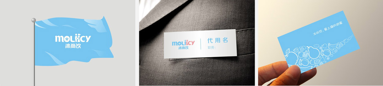 Logo標識是傳播產(chǎn)品理念和精神的載體。冰尚飲的logo設計源自moliicy,取自漢語“魔力”的拼音和冰的英文icy的結(jié)合,寓意魔力與冰的結(jié)合,logo主色調(diào)采用粉藍色與粉紅色,迎合冰尚飲年輕時尚的消費群體的色彩喜好,logo整體結(jié)構(gòu)設計一目了然。在不影響其整體視覺識別的情況下,在“魔”字的尾音字母O上賦予其雪花的形體,象征著冰爽、清涼、浪漫之意;在moliicy一詞中間兩個i的字母,利用其字形優(yōu)勢設計成一男一女,這兩個i一個代表魔力,一個代表冰,中間的愛心結(jié)合象征魔力與冰的結(jié)合相融。易記易懂,且色調(diào)和形體都不失時尚大方之體,將品牌的“冰”、“尚”、“飲”完美演繹。