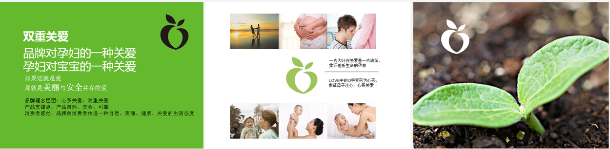 而嫩綠的標(biāo)準(zhǔn)色,向消費(fèi)者傳達(dá)了一種自然、美麗、健康的生活態(tài)度。由花瓣組合而來的標(biāo)志,暗喻了母親猶如花朵般孕育著生命。標(biāo)志的外形,像是從中文字“孕”的上半部分演化而來,還像是爸爸媽媽的兩雙手,雙重保護(hù)著還在子宮內(nèi)生長的孩子。寓意著孕愛能為母親和寶寶雙重關(guān)愛、雙重保護(hù)。