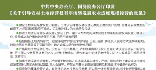 原標(biāo)題:農(nóng)村土地流轉(zhuǎn) 用五年時(shí)間完成確權(quán)頒證 培育新型農(nóng)業(yè)經(jīng)營(yíng)主體——專(zhuān)家詳解農(nóng)村土地流轉(zhuǎn)及農(nóng)業(yè)適度規(guī)模經(jīng)營(yíng)(點(diǎn)擊查看大圖) 11月20日,《關(guān)于引導(dǎo)農(nóng)村土地經(jīng)營(yíng)權(quán)有序流轉(zhuǎn)發(fā)展農(nóng)業(yè)適度規(guī)模經(jīng)營(yíng)的意見(jiàn)》公布。推動(dòng)土地流轉(zhuǎn)、發(fā)展規(guī)模經(jīng)營(yíng)對(duì)當(dāng)前我國(guó)農(nóng)業(yè)生產(chǎn)有何意義?在推進(jìn)過(guò)程中,農(nóng)民的權(quán)益怎么保證?如何避免工商資本進(jìn)入農(nóng)村后造成非糧化…